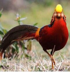 紅腹錦雞(學(xué)名:Chrysolophus pictus)又名金雞,中型雞類,體長(zhǎng)59-110cm。尾特長(zhǎng),約38-42cm。雄鳥(niǎo)羽色華麗,頭具金黃色絲狀羽冠,上體除上背濃綠色外,其余為金黃色,后頸被有橙棕色而綴有黑邊的扇狀羽,形成披肩狀。下體深紅色,尾羽黑褐色,滿綴以桂黃色斑點(diǎn)。雌鳥(niǎo)頭頂和后頸黑褐色,其余體羽棕黃色,滿綴以黑褐色蟲蠢狀斑和橫斑。腳黃色。野外特征極明顯,全身羽毛顏色互相襯托,赤橙黃綠青藍(lán)紫具全,光彩奪目,是馳名中外的觀賞鳥(niǎo)類。為中國(guó)特有鳥(niǎo)種,該物種分布的核心區(qū)域在中國(guó)甘肅和陜西南部的秦嶺地區(qū)。