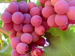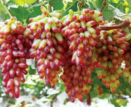 果實味美色艷。果穗圓錐形,中等大小,而果粒整齊緊湊,穗重800克左右,最大穗重1600克。果粒橢圓稍長型,顏色透亮,果霜鮮艷,單粒重6到8克,可溶性固形物含量20%—25%,2糖酸比5.9:1,果肉淺紅色,肉質脆能切片,既可鮮食又可制干。果皮脆,可以隨果實一起食用。