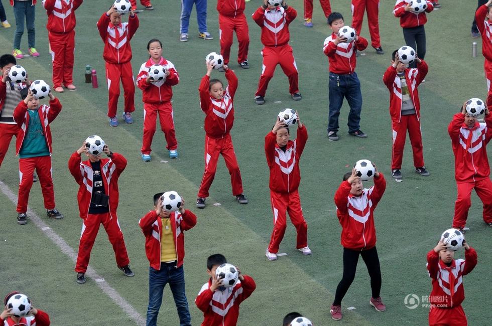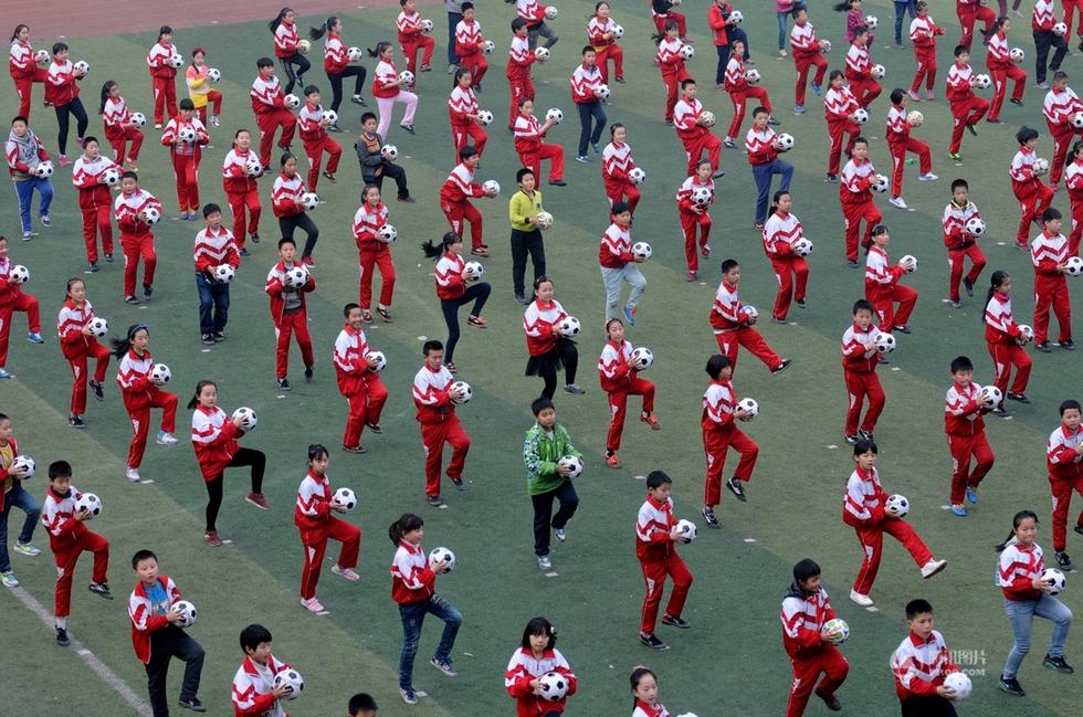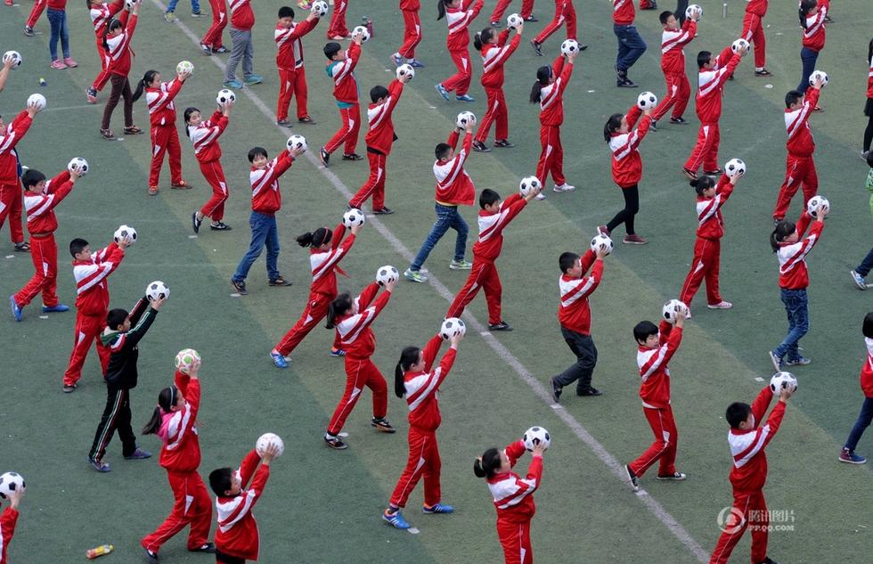 2015年3月16日,在河南省洛陽市澗西區(qū)景華路實驗小學(xué)的操場上,同學(xué)們正在練習(xí)學(xué)校老師自編的足球操。據(jù)了解,自從校園足球上升為國家戰(zhàn)略后,該學(xué)校開始自編足球操,準備在大課間推廣足球操,推進校園足球普及,促進青少年強身健體、全面發(fā)展。