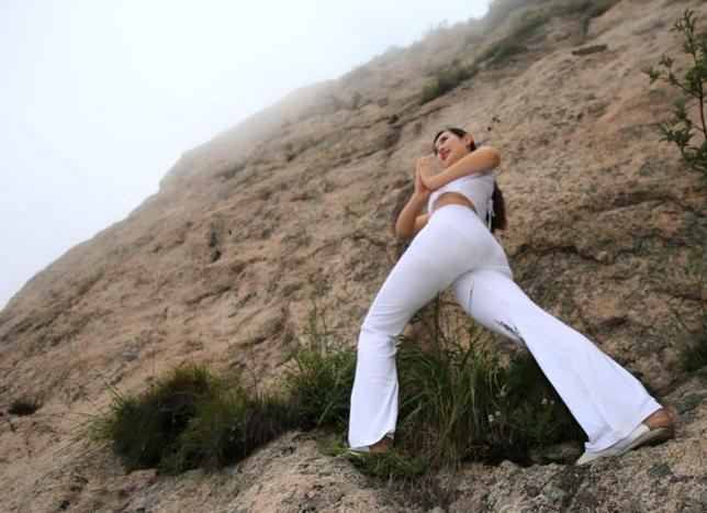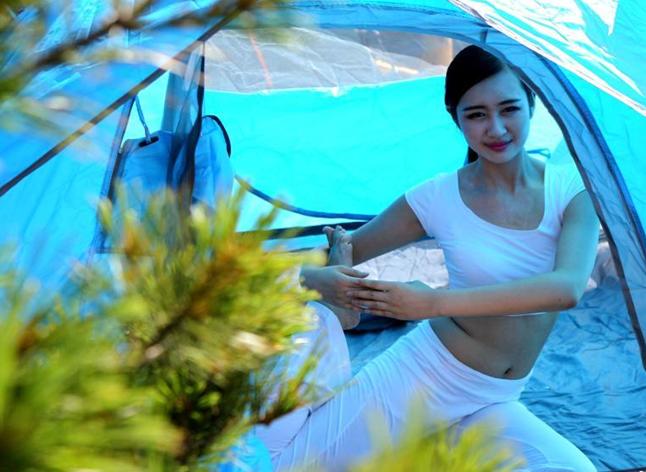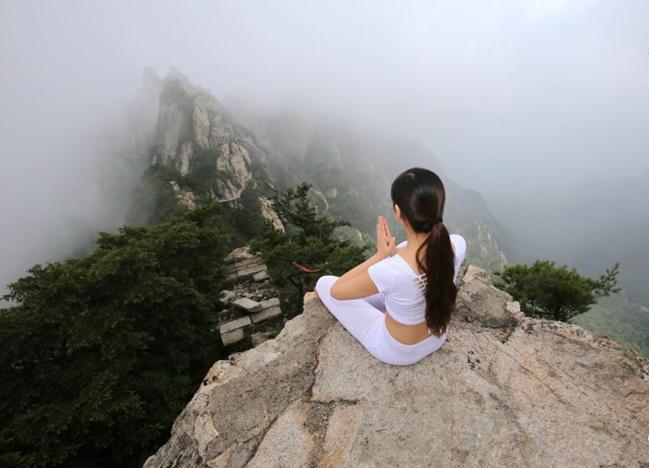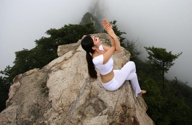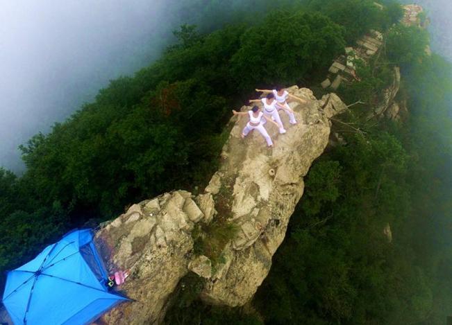 7月18日,河南老君山露營節(jié),美女辣妹在2000米伏牛山頂,云霧蒸騰懸崖絕壁中安營扎寨,白衣辣妹冒險在帳篷邊懸崖上半云半霧中修煉瑜伽,背后道觀直插云霄猶如仙宮若隱若現(xiàn),腳下深不見底,看得人心驚膽戰(zhàn)。