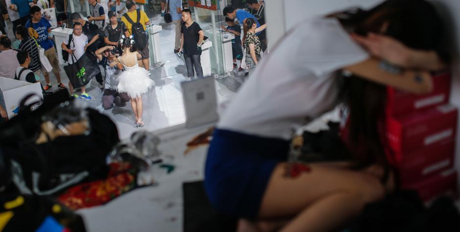 早上的chinajoy現(xiàn)場還沒熱鬧起來,化妝間里,造型師還要為showgirl們再精心打扮一番。每天十個(gè)小時(shí),展臺上的姑娘們要蹬著十厘米的高跟鞋走上走下!皫滋煜聛,我的小腿已經(jīng)僵了,沒有感覺了,上臺整個(gè)人都在晃,還要使勁地硬撐著”。