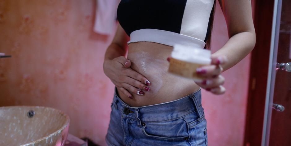 卸好妝,岑岑拿出一大瓶瘦身油,開始輪番在肚子、手臂和腿上涂抹,“這東西感覺辣辣的,要不是為了工作,我這么努力減肥干嘛啊。”