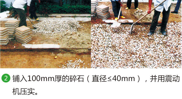 2、鋪入120-150mm透水混泥土,碎石(直徑10-20mm)并用振動機(jī)壓實(shí)