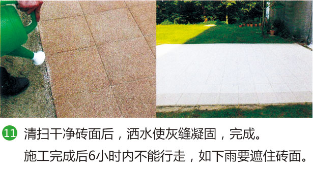 11、清掃干凈磚面后,灑水,使灰縫凝固,完成。施工完后6個小時內(nèi)不能行走,如下雨要遮住磚面