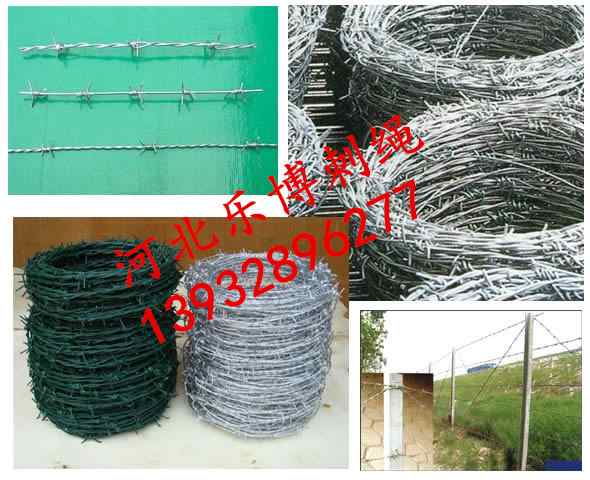 刺繩材質(zhì):低碳鋼絲(鍍鋅、涂塑、噴塑)pvc絲;有蘭、綠、黃等顏色。pvc刺繩芯線可以是鍍鋅絲和黑絲。