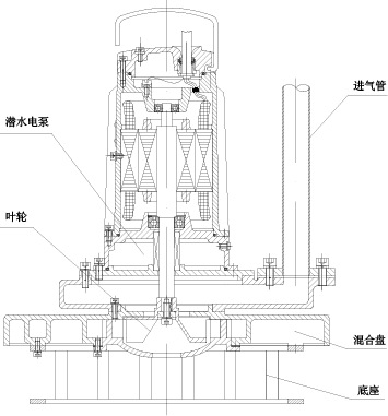 qxb 型離心式潛水曝氣機為直聯(lián)式結(jié)構(gòu)。旋轉(zhuǎn)的葉輪在水中產(chǎn)生一個離心力,通過離心力在葉輪周圍形成一個負壓區(qū),空氣通過進氣管被吸入,被吸入的空氣和水在混合盤內(nèi)混合,隨后這種良好的均勻的混合物自動從排出口排出。