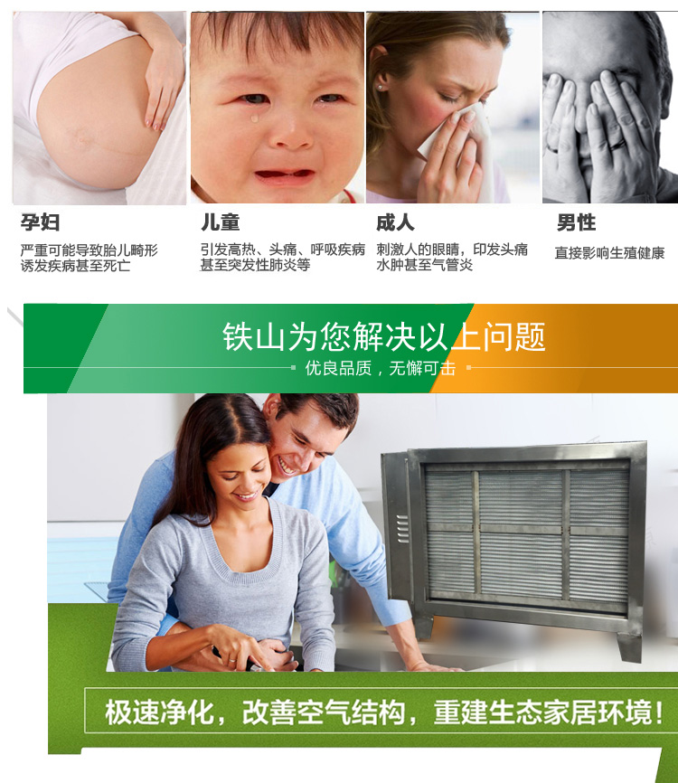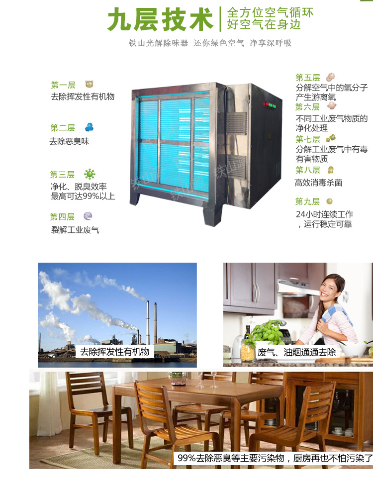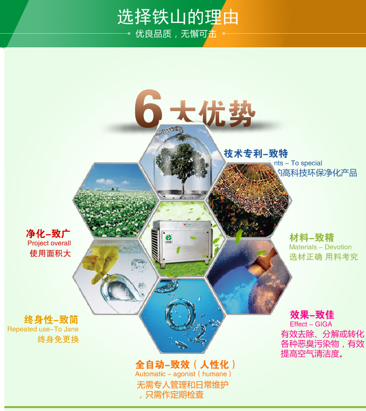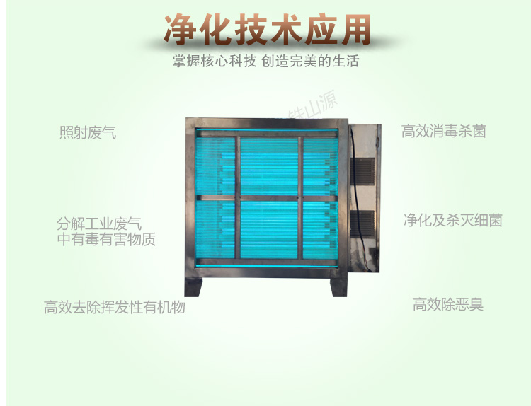 八、環(huán)保高科技專利產(chǎn)品:采用國(guó)際上最先進(jìn)技術(shù)理念,通過(guò)專家及我公司工程技術(shù)人員長(zhǎng)期反復(fù)的試驗(yàn),開(kāi)發(fā)研制出的,具有完全自主知識(shí)產(chǎn)權(quán)的高科技環(huán)保凈化產(chǎn)品,可徹底分解工業(yè)廢氣中有毒有害物質(zhì),并能達(dá)到完美的凈化效果,經(jīng)分解后的氣體,可完全達(dá)到無(wú)害化排放,絕不產(chǎn)生二次污染,同時(shí)達(dá)到高效消毒殺菌的作用。