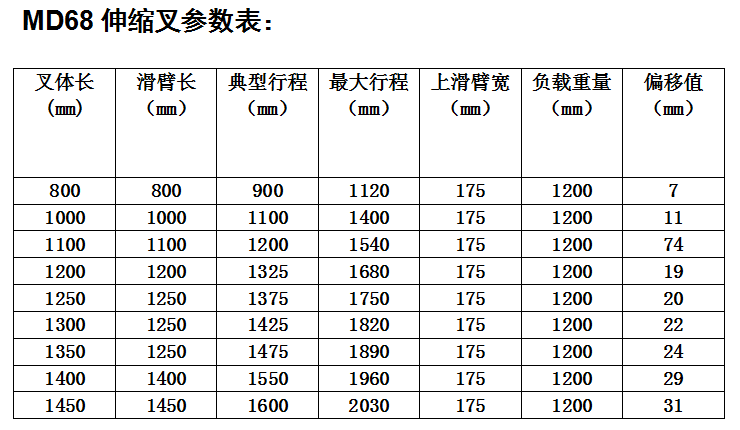 md68型伸縮叉的滑臂175mm寬,68mm高(h),此伸縮叉另有兩個(gè)版本可供選擇:m65和m71,長度相同;滑移的高度(h)分別為65mm和71mm,這些尺寸的產(chǎn)品特別適合于移載歐標(biāo)托盤或類似容器,負(fù)荷可達(dá)1200公斤。