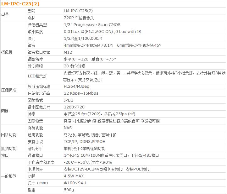 lm-ipc-c25(2)是一款像素 為720p的停車場車位專用的車牌識別攝像頭,最多可實(shí)時監(jiān)控2個車位,其附帶的led燈在車位處于占用、空閑、車輛壓線狀態(tài)時可分別顯示為紅、綠、黃三種顏色。